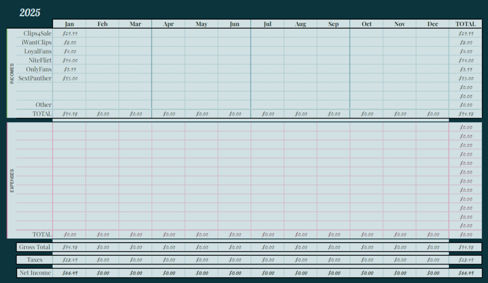 Are you an online content creator using platforms like C4S, iWC, NF, LF, or OF? Do you struggle to keep track of your income and business analytics in one place? Say goodbye to the hassle of manually entering data and complicated spreadsheets—this Income Tracker & Business Analytics Tool is exactly what you need to take control of your finances and grow your business with ease!